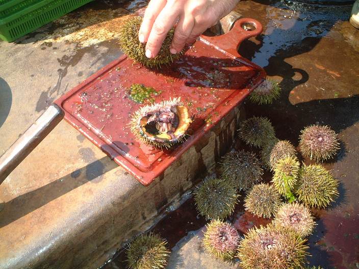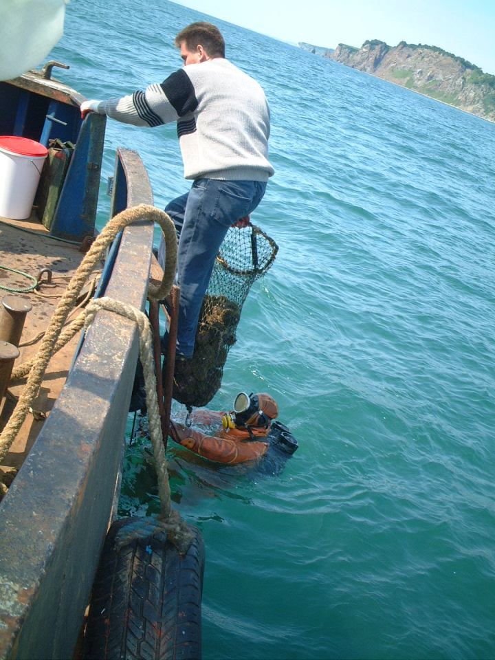 するとほどなく船長の子分が潜水服に着替え,海中へとエントリーした.10分位であがってきた背中には,バフンウニ満載の大きな袋が・・・.船上でウニを割って,ウォッカでウニを流し込むのか,,,ウニでウォッカを流し込んだのか酒宴は続いた.いや~,チャーター料にウォッカ代とウニ代も含まれていたか~.味の方は?って,実入りはたいしたこと無かったように記憶するが,写真をみるとそうでもない.
