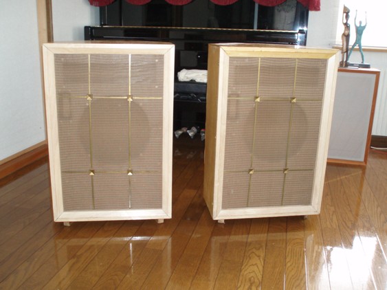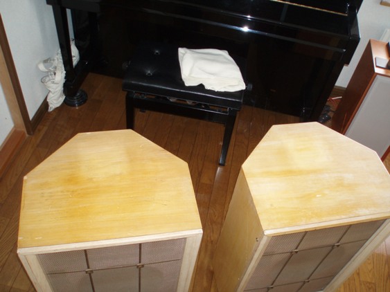 ちょっとめずらしい仕上げ色のもので,程度はそこそこ.木はカラカラに乾ききっていて,“やっぱアメリカだ~“なんて思ったものだ.前面バッフルの外縁の桟木を止めてある木ネジ数本をはずし,組み合わせてある桟木を分解すると,バッフルをとめてある木ネジが現れる.これを外してバッフルをあけると内部が現れる.バッフルは3way用の穴が開いていて,これを裏側から板をあてて塞いであった.内部にはグラスウールではない吸音材が貼ってあった.面白いことに,どちらのエンクロージャにも側板上部に幅1cm,縦2cmくらいの楕円形の穴があいている.SPのバックキャビティ部分の気密性は関係ないのだろうか?気になったので,ここを消しゴムで塞いだりしたが,音の違いはわからなかった.板の突合せ部分の精度はあまり良いとは言えなくて,”やっぱアメリカだ~”.