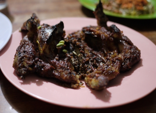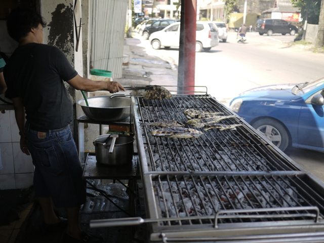 イヤン・バカンではない.イカンは魚,バカールは炭焼き・グリルすること.言葉で書いてしまうと,なんてことはない魚の焼き物である.なのに,かくもインドネシア人のソウルを鷲づかみにしている食べ物なのである.材料となる魚はサンゴ礁の海でとれた根魚が主体だが,養殖された淡水魚もある。大きなものは2枚に背開きにして(頭もしっかり2分割),それ以外はエラ・内臓を取ったあと丸のまま焼かれる.大抵は店の入り口や外で,大きな焼き網の上で,煙なんぞをいい匂いとともに盛大に出しながら焼いている.どうやらレストランではバカールの類はあまり無くて,ゴレン,つまり油揚げになることが多いようである.レストランで盛大な炭焼きはちと難しいのだろう.バカールは道端の屋台やワルン,あるいはもう少し上等なレストランと称するワルンで,炭と煙と肉や魚の焦げる匂いとともに調理され,食されるもののようだ.なるほど,ソウルフードっぽくなってきた.