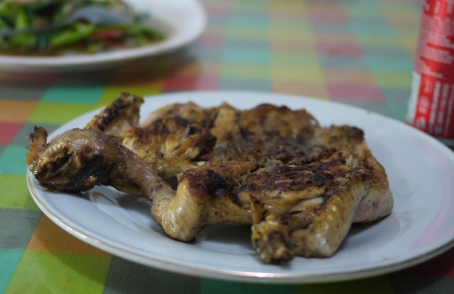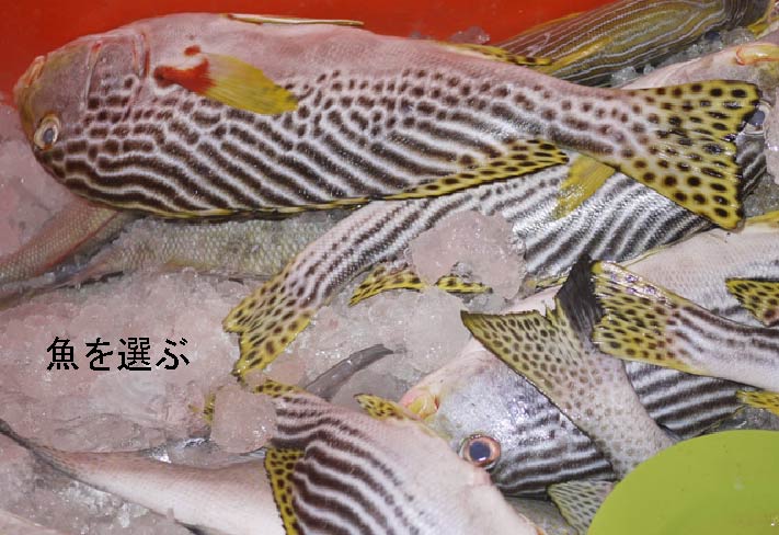 少し上級の店になると,道端から中が見通せなくなり,つまり壁があり,部屋の中で,まだ壊れるまでは相当の時間があるテーブルと椅子について食べる.また,店の入り口で冷蔵ボックスの中の魚を自分で選んで,焼くときのタレなんぞを注文してから席につくタイプの店などがある.とにかく,メインディッシュのイカン・バカールを頼むと,手洗いのお椀のほか,色々薬味が出てくる(サンバルソースのみのときもあるが).ナシ・プティ(ご飯)に飲み物と,野菜,たまにスープなどを頼んで,さあ!,と,いただくのである.