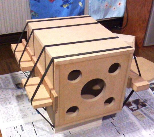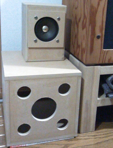 いろいろ情報をあさって、箱の形状やらの概要は頭にあったので、”よし、やろう!!”と思ってから2日でここまでできた。15mm厚のMDFをホームセンターで購入・切断、自宅でSPとダクトの穴を自在錐であけ、昨夜サッカーの韓国戦を見ながら接着・組立まで。この先、丸穴の角と箱のコーナーをルーターで丸くして、ダクトをつけて、、、、で3月中に塗装を含めて完成させ、引き渡し予定。