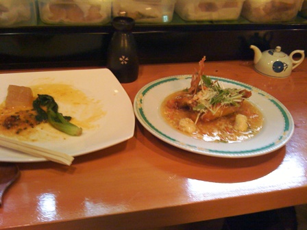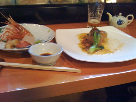 と結構洒落た店構えの目新しい料理店を発見、遠巻きに様子を伺うも、窓がないので店内の様子は皆目見当がつかない。ほかに面白そうな店が見つからなかったので。えいっと店内に入る。右手の小上がりに女性のグループがいるので、危険な店では無いようだ。カウンターに通されると、その向こうにすごいのがいた。ここの店主の雰囲気、結構深い。ん~、すごくおっかない漁師の親爺ってところ。メニューがないのでお任せのみだろうと推測、これは当たり。2.5k円くらいから4k円くらいの値幅になっていて、料理の品数が変わるそうだ。もし失敗だったら別の店で寿司でもと思い、品数が一番少ないコースを所望。初めは刺身、まずますのものが入っていて悪くない。で次の皿が驚き、とろとろに甘く煮込まれた蕪の上にウニのソースがかけられている一品。蕪の上にウニの黄色、チンゲン采?の緑が回りに配された洋風な色合いで見た目鮮やか。このウニソースが濃厚・ミルキーでたまらない。この親爺がこれをつくるのっ???、驚きっ!ソースも全部舐めるように食べました。で最後は中華風、キンキを揚げたものにカニ身の入った餡がかかったもの(2010.2.15修正)。これまたびっくりだったのが、結構キックのあるピリ辛味だったこと。ボリュームもたっぷりだった。
