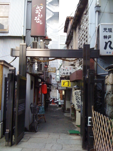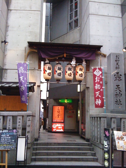 ななんと,狭い小路の両側に飲食店がひしめき合う,商店街もとい繁華街の真っ只中に同化した,コンクリート打放し造の“お初天神ビル”があった.その根元になにやら入り口というか,門と言うか,がある.おぉ,見事ってのが第一印象.境内の中に入ると,これはきちんとした神社なのだが,脇には狭い裏口のような入り口があって,1間に満たないほどの狭い小路が続き,両側にはコテコテの飲み屋がひしめき合っている.