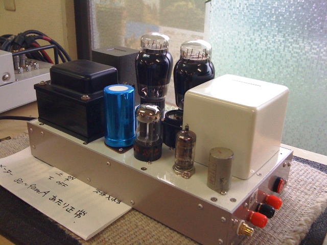 6月末に10日間の連続出張があったため,本格的な工作は7月に入ってからとなった.先週の連休初めに完成, 早速鳴らしてみると,始めはなんともさびしい音で,へこんでしまった.しかし我慢して鳴らしていると,2日目には結構いい感じになってきた.2A3ってのは情感たっぷり,ファットな音質をイメージしていたのだが,このアンプの音質はどっちかというとスッキリさわやか系,ミネラルの含まれた清水って感じ.こんなのも悪くないと,結構気に入り始めた.と,そんなところでショップに持ち込んだ.はたしてParmecoはどう鳴るか?
