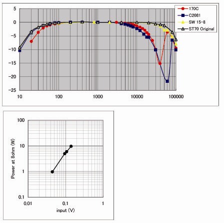 聴き始める前にf特をとってみたのが下図.概ねOPT単体での測定結果と同様である.ST70オリジナルOPTはSW-15-8とがほぼ同様である.UTCとP&Cが同様にナローな特性で,P&Cは少し高域側,UTCは低域側に伸びている.ナロー組ではP&Cが意外とバランスがとれているような気がする.P&Cに聴き始めはどうも良くなかったが,少し鳴らしていると変わってきたようであり,これからの比較でどんな結果となるか...