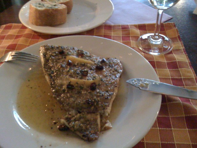 で,マッセルを食べながらメインを選ぶ.と,鯛のバスク風ってのがある.写真を見ているうちに,モーリタニアでポルトガル人の某社スタッフが作ってくれた黒鯛のポルトガル風フライを思い出し,これに決定.店内担当のマダムが厨房に入ってスペイン語でオーダーを伝える.しばらくして出てきたのは,大きな切り身二つ,オリーブオイルでソテーされていて,皮がこんがりパリッと仕上がっている.辛辛仕上げのポルトガル風とは違って,オリーブオイルの風味が主体の塩味,これもまた良し.切り身が大きいので,ほぼ満腹.