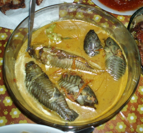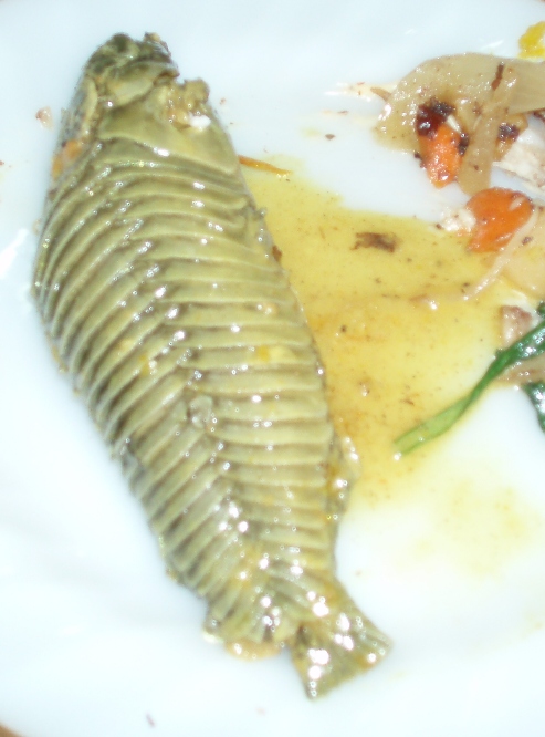 とにかく,あっちこっちでクイクイ言うものだから,とうとう現地のさる方から,ご自宅でスリナム料理をご馳走してくれるとの招待を受けた.もちろんクイクイincludedである.どんなものが出るか,興味津々である.で,とうとうご対面したクイクイ料理がこれ.ココナツミルクのたっぷり入ったカレー煮である.クイクイはgutsをとっただけの姿のままである.こいつは,頭を指で押さえ,反対の手の指で鎧ウロコを尾の方に滑らすと簡単に身から皮と鎧ウロコを分離できる.現れた肉はプリッとしっかりしていて,これにココナツカレーソースが良く効いて,美味!あっしはしっかり2匹いただいた.