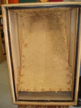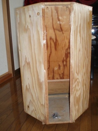 ちょっとめずらしい仕上げ色のもので,程度はそこそこ.木はカラカラに乾ききっていて,“やっぱアメリカだ~“なんて思ったものだ.前面バッフルの外縁の桟木を止めてある木ネジ数本をはずし,組み合わせてある桟木を分解すると,バッフルをとめてある木ネジが現れる.これを外してバッフルをあけると内部が現れる.バッフルは3way用の穴が開いていて,これを裏側から板をあてて塞いであった.内部にはグラスウールではない吸音材が貼ってあった.面白いことに,どちらのエンクロージャにも側板上部に幅1cm,縦2cmくらいの楕円形の穴があいている.SPのバックキャビティ部分の気密性は関係ないのだろうか?気になったので,ここを消しゴムで塞いだりしたが,音の違いはわからなかった.板の突合せ部分の精度はあまり良いとは言えなくて,”やっぱアメリカだ~”.