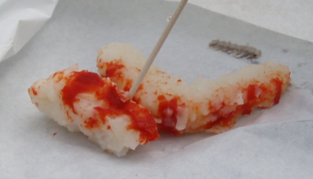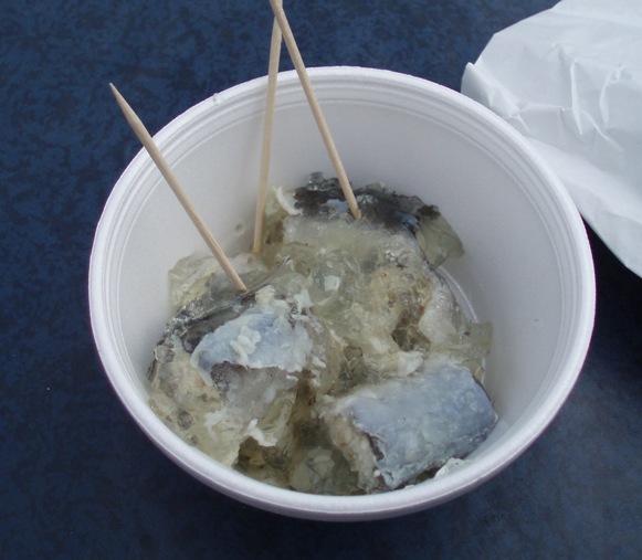 別にBrixhamはひどいところだと言うのではない.反対に,観光で行くならぜひ予定に入れるように進める.ことは,次のような次第.Brixhamの漁港のすぐ前の広場は,屋台やらレストランやら土産物屋やらが集まって,大層にぎやかで楽しいところである.で,ついにあの屋台売りseafoodを発見.アサリやムールの剥き身のゆでたヤツ,あった!ウナギのゼリーよせ,それにカニの剥き身.よしよし,みーんな食べてやるってつもりで,まずはウナギとカニを購入.カニにはスティックとハサミの身があって,スティックの方は明らかにカニカマ.ここで気が付けばよかった.ウナギのほうはまずまず,これをまねて鮎を使って自分で作っていたが,予想通りの味だった.でおっとり刀でカニを口に入れて,“Shiiiiiiit !,下手糞カニカマだぁぁぁぁぁ!”