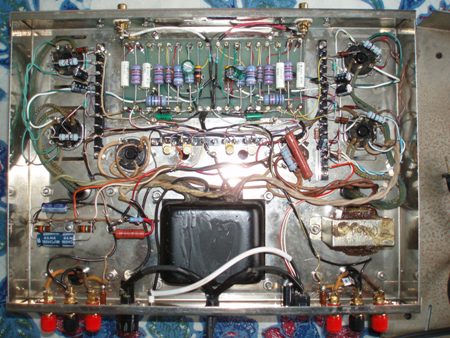 ←明かりはいまひとつだったかな.PTはやっぱり熱くなる.また,片チャンネルで20W出すとB+がずいぶん下がる.Dynaco ST-70のPTでは大きな出力での連続使用は無理のように思う(家庭ではそんな必要はないが).